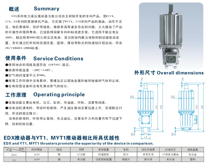 EDX系列電力電壓推動器為我公司自主研制開發(fā)的專利產(chǎn)品,是MYT1、YT1、ED系列的更新?lián)Q代產(chǎn)品,他克服了MYT1、YT1系列產(chǎn)品的漏油,動作不靈活、電機易燒壞,防護等級低、維修率高等諸多存在的問題,大大提高了產(chǎn)品的可靠性和使用壽命。已經(jīng)獲得國家專利和科技進步獎。它適用于額定電壓380V,額定頻率50HZ的三相交流電源,是目前國內(nèi)理想的制動器驅(qū)動裝置,并可通過杠桿機構完成往復、圓周、擺動等形式的快速短行程運動,符合JB-/T10603-2006標準。